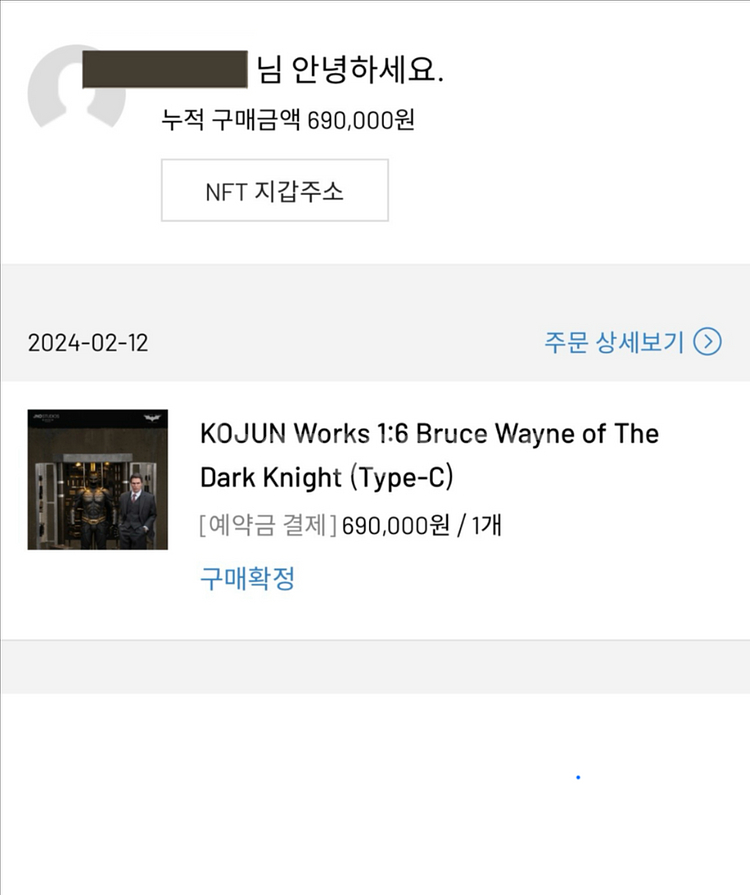 고준웍스(JND) 다크나이트 브루스웨인 C타입 예약금 양도합니다. 공홈에서 2024년 예약금 결제했으며, 잔금 결제 요청 문자 받은 뒤, 아직 잔금은 결제하지 않은 상태입니다. JND 업체로부터 양도 가능하다는 답변 받았습니다. 저에게 예약금 69만원을 28만에 구매하시고, 양수하신 뒤, 구매자님 정보로 잔금 결제하시면 됩니다. 영1영- 삼44삼-9칠이4 감사합니다.