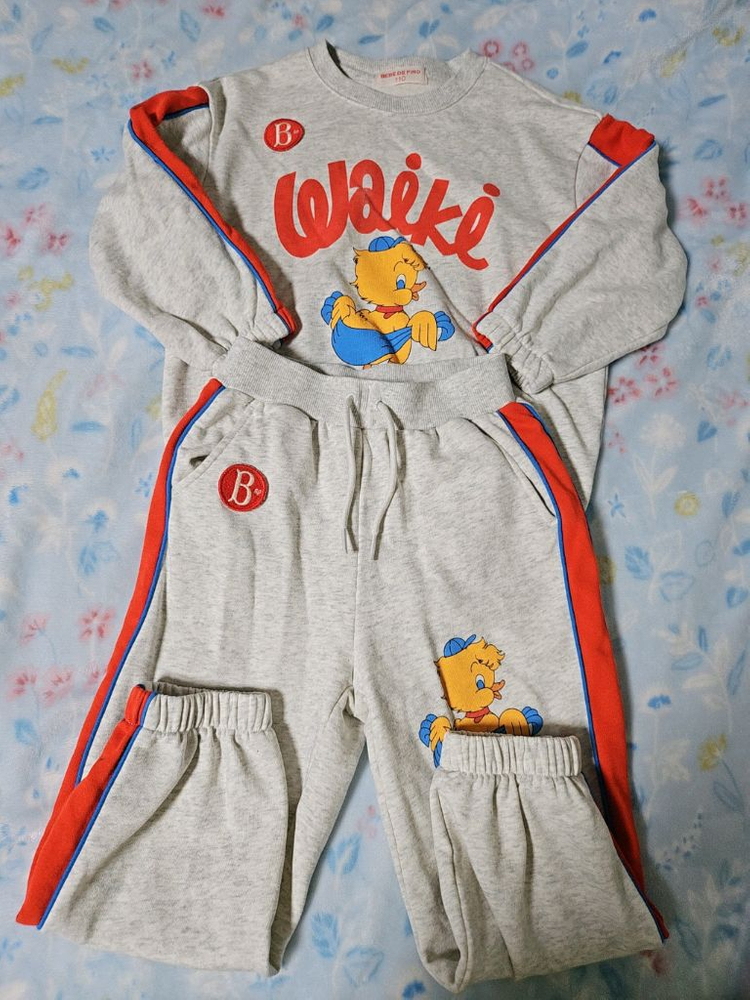 베베드피노 Waike 상하복 세트 110 사이즈입니다 그레이 색상에 귀여운 오리 캐릭터와 Waike 로고가 포인트로 들어가 있어요 면 소재로 아이들이 편안하게 입을 수 있습니다 상하의 모두 깨끗하고 좋은 상태입니다