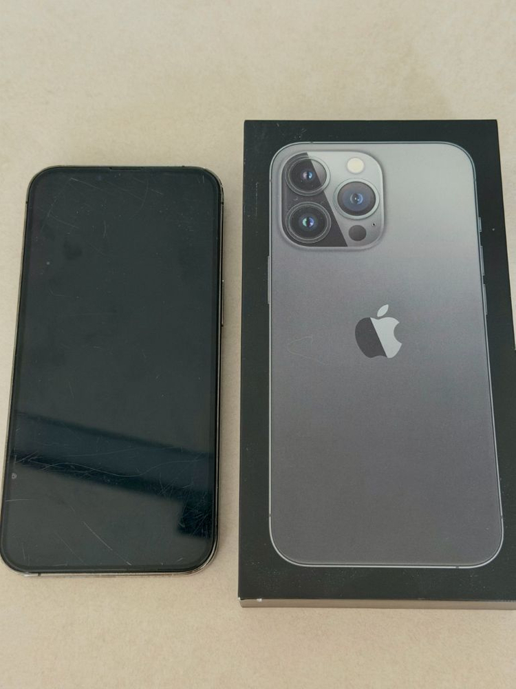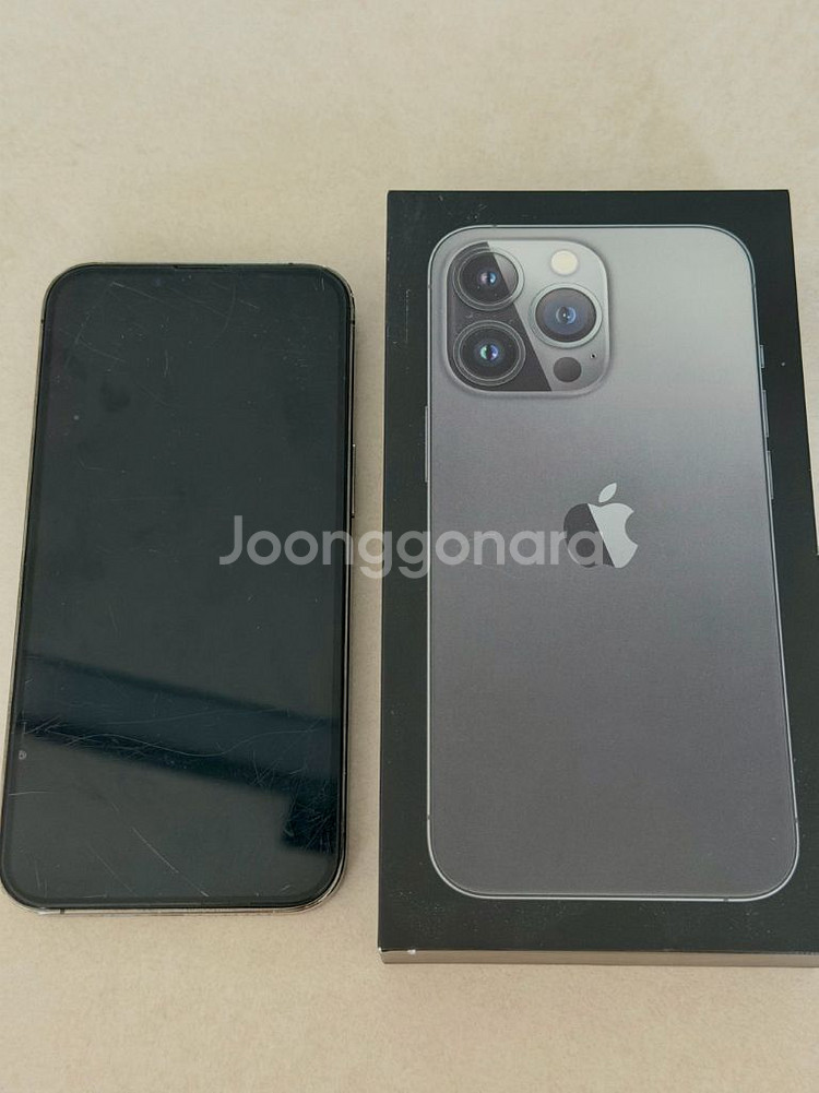 아이폰 13 Pro 128GB 그래파이트 색상입니다. 배터리 성능 74%이며, 화면에 기스 및 전반적인 사용감 있습니다. 전면·후면 카메라 모두 정상 작동합니다. 박스 보유 중이라 함께 드려요.
