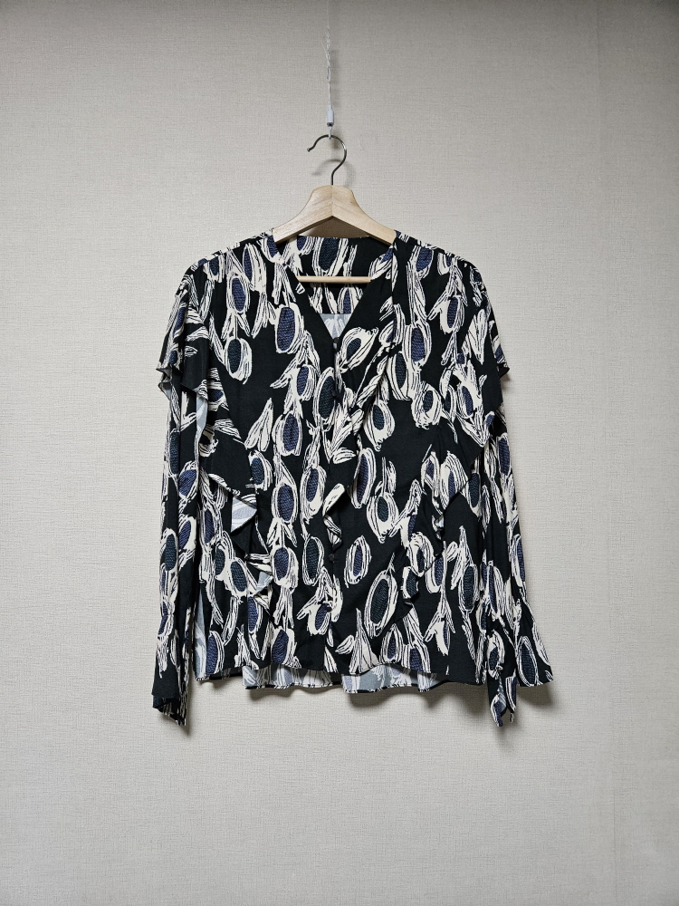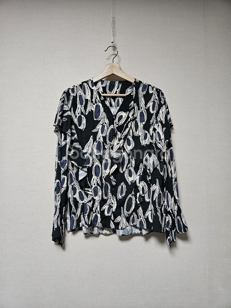 한섬 래트바이티 LATT 패턴 러플 블라우스 55사이즈 하늘한 얇은 레이온 소재로 신축성은 없고 봄가을 이너, 초여름 단독 정도 다크그린 바탕에 패턴, 단추 여밈 전면 오픈이고 상단 단추여밈 사이는 슬릿 조금 있어요 살짝 언밸런스한 러플디테일과 아랫단 옆트임, 소매끝 트임 자연스러운 생활사용감 정도는 있고 전체적인 컨디션 양호한 편입니다 . 사이즈 가슴단면 53 뒤 기장 68 앞 기장 62 55사이즈입니다