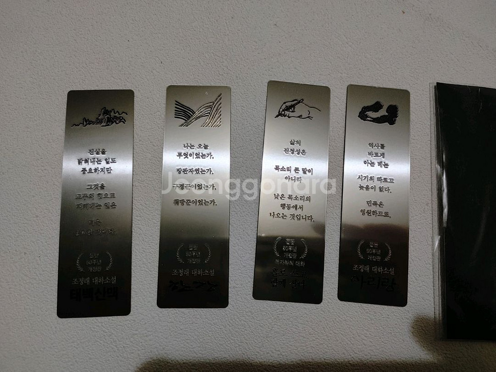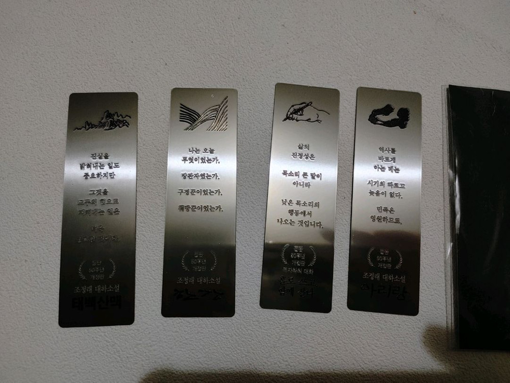 개인정보(거래정보)를 주고받는 행위는 사기에 노출될 수 있으므로 즉시 중고나라로 신고해 주세요조정래 소설 금속 책갈피 세트입니다. 새 제품이며, 비닐 포장 그대로 보관 중입니다. 각 책갈피에는 조정래 작가의 대표작 구절들이 새겨져 있습니다. 교환 반품 환불 불가 묶배가능 신중히 구매 해주세요.