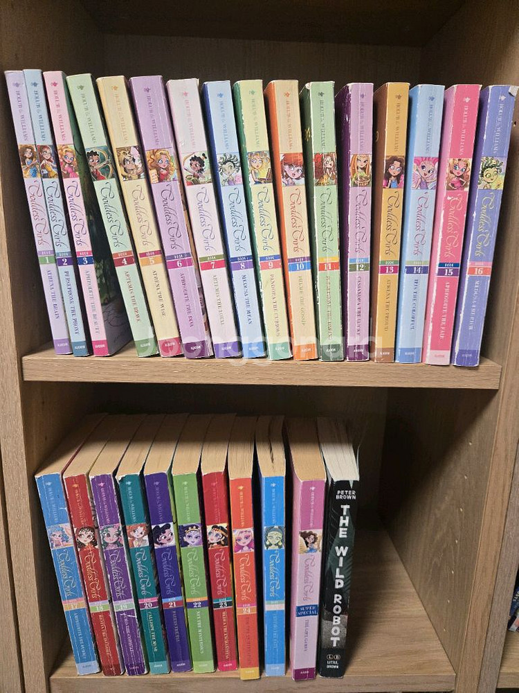Goddess Girls 시리즈 원서 1권부터 25권+특별책 1권까지 세트로 판매합니다. 5점대지만 글밥이 적어서 여아들이 글밥 늘리기 좋습니다. 책 내부는 빛바램 외 읽는데 지장이 없으나 연식이 있고 책기둥에 사용감이 있어서 저렴하게 판매합니다. 자세한 상태는 사진을 참고해주세요. 같이 읽기 좋은 와일드로봇 1권 덤으로 드려요. 택포 가격이니 하실분만 연락주세요.