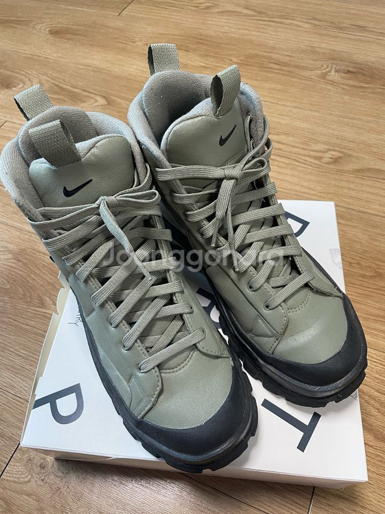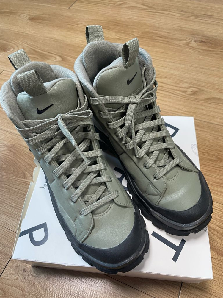 나이키 블레이저 롬 미드 워커 스타일입니다 올리브 색상이고요, 밑창은 오렌지색입니다 사이즈 240 작년에 사놓고 5번도 안 신었어요. 거의 새것 접지력이 좋아서 미끄러운 길에서도 안전하게 신을 수 있습니다