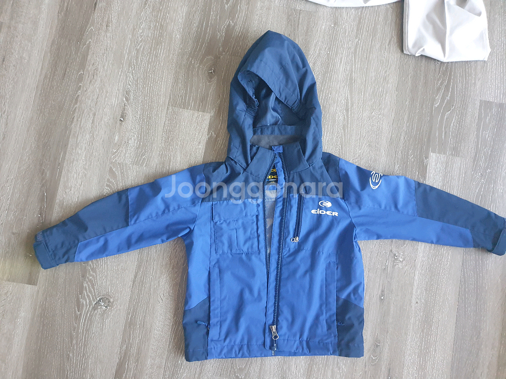 아이더 남아 바람막이 자켓 110사이즈입니다. 모자가 달려있어 활용도가 높고, 파란색 투톤 배색이 예뻐요. 가슴 부분에 아이더 로고가 고급스럽게 들어가 있습니다.