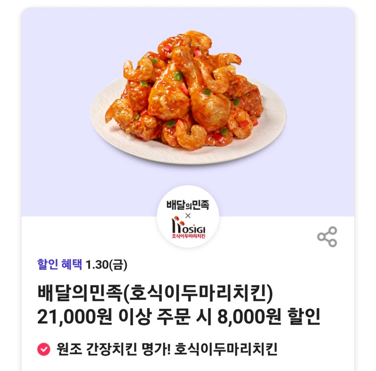 배달의민족(호식이두마리치킨) ㅡ2윌 4일까지 유효기한 21,000원 이상 주문 시 8,000원 할인 * 가게배달/픽업 또는 배민배달 주문 시 사용 가능 * 배달비를 제외하고 21,000원 이상 주문 시 혜택을 받으실 수 있습니다.