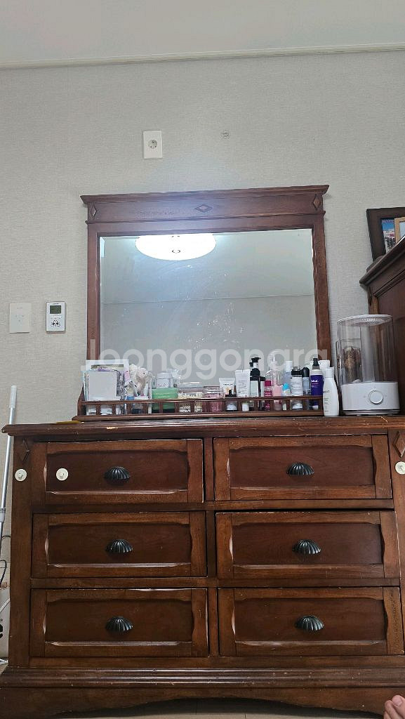 클래식한 디자인의 원목 화장대와 서랍장 세트예요. 거울과 다양한 수납공간이 있어 실용적이고, 전체적으로 상태가 양호합니다. 따뜻한 월넛 컬러가 인테리어 포인트로도 좋아요.