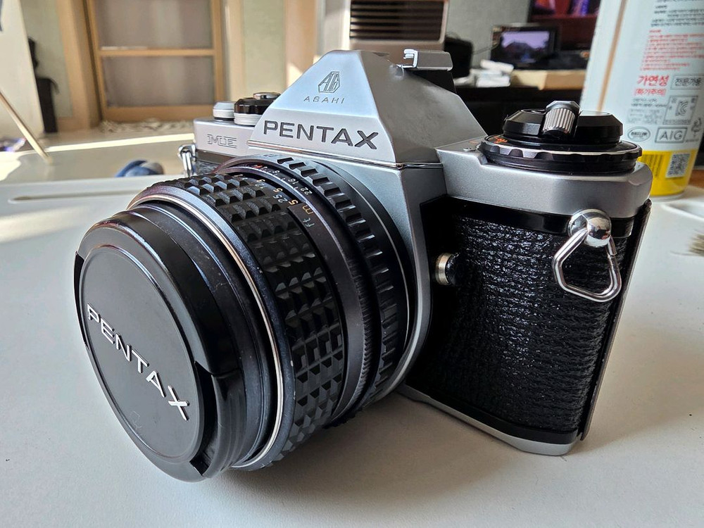 펜탁스 ME 필름 카메라와 SMC PENTAX-M 1:1.4 50mm 렌즈, 렌즈캡, 케이스 구성입니다 카메라 바디와 렌즈 모두 전체적으로 양호한 상태를 유지하고 있습니다. 1월29일 제일 카메라에서 노출계 수리하여 정상작동하여 수동카메라지만 조리개 값에 따라서 자동으로 셔터 스피드 조절되어 초보자도 쉽게 찍을 수 있습니다. 렌즈는 50mm 1.4로 밝은 렌즈며 컨디션은 사진과 같이 스크래치 하나 없으며 이정도 컨디션 렌즈 찾기 어렵습니다. 케이스에 넣어서 보관 했기때문에 바디 상태도 좋습니다만 상부에 눌린자국이 있으나 작동에는 영향 없습니다. 렌즈 캡도 같이 드립니다. 케이스는 낡았으나 원하시면 같이 드립니다.