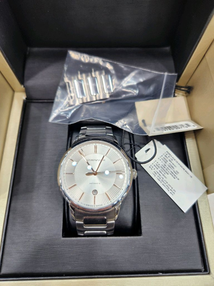 개인정보(거래정보)를 주고받는 행위는 사기에 노출될 수 있으므로 즉시 중고나라로 신고해 주세요엠포리오 아르마니 스위스 메이드 오토매틱 시계입니다 상태는 사진과 같이 좋습니다 박스와 보증서 포함입니다 세련된 디자인이 돋보입니다 100% 정품입니다.