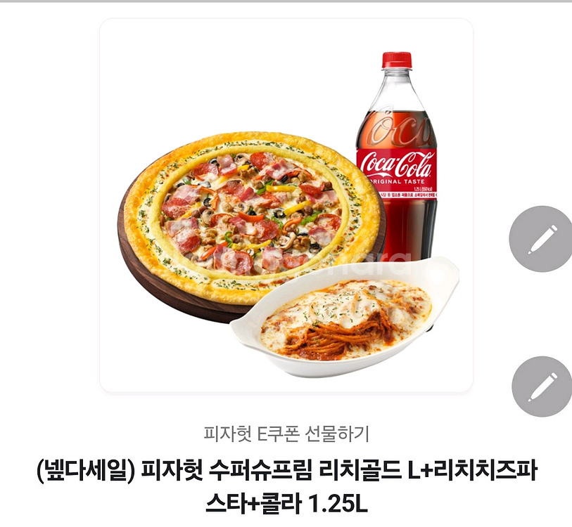 피자와 리치골드 L+리치치즈파스타, 콜라가 포함된 세트입니다. 맛있는 식사 즐기실 수 있어요! 오늘까지에요 24900원에 구입했는데 깜빡해서 못먹어서 올립니다