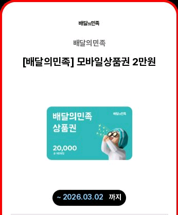 배민에서 사용 가능한 2만원 모바일 상품권이에요. 유효기간은 2026년 3월 2일까지입니다.