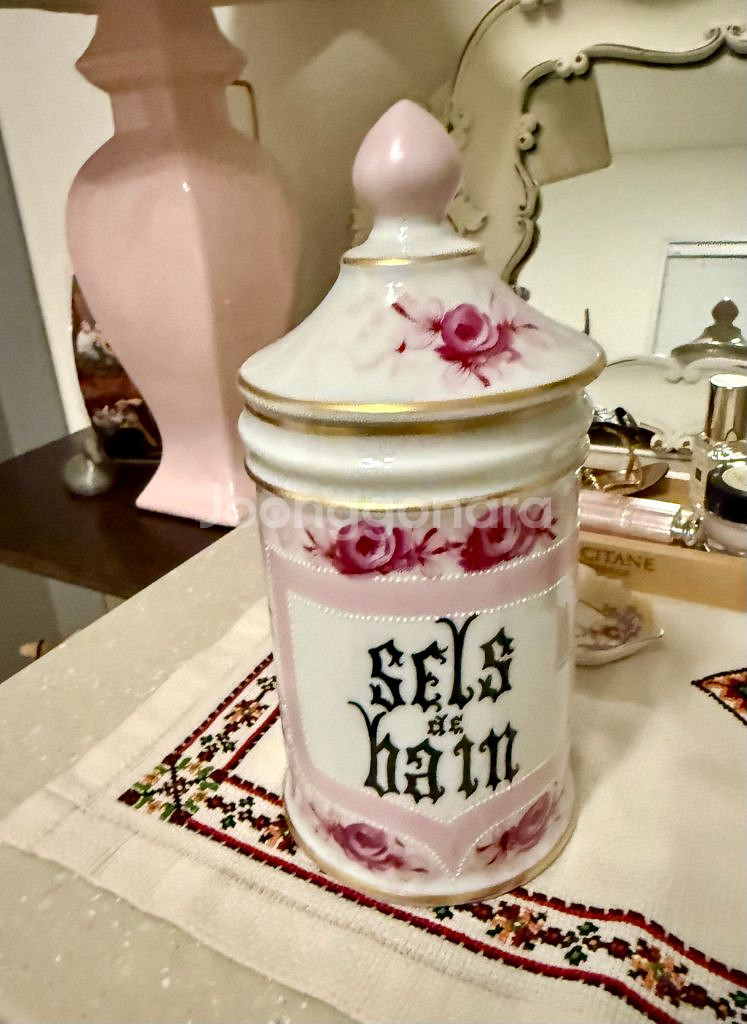 흰색 도자기에 분홍 장미꽃 패턴과 금색 라인이 들어간 제품으로, 프랑스 빈티지 특유의 우아한 분위기가 살아 있습니다. 전면에 “Sels de bain” 문구가 있어 원래는 목욕 소금 보관용으로 사용되던 도자기 단지입니다. 현재는 인테리어 소품으로 많이 활용되며, 쉐비 시크 · 앤틱 · 프렌치 빈티지 인테리어에 잘 어울립니다. 화장대, 욕실 선반, 콘솔 위에 두기 좋아요. 전체 높이: 약 20cm • 지름: 약 8cm • 본체 높이(뚜껑 제외): 약 13.5cm ✔ 참고 • 장식용 소품으로 추천드립니다 • 빈티지 제품 이해 있으신 분께 구매 부탁드려요