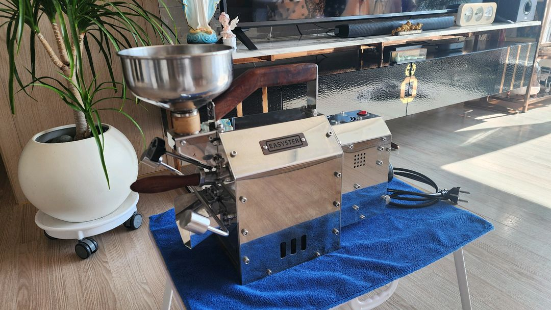 커피 로스팅 머신이에요. 꼭 이 로스팅기를 잘 아시는 분께만 추천합니다. 수망이나 후라이팬 로스팅을 벗어나게 해주었던 고마운 녀석입니다. 지금은 큰회사가되어 가정용 수제 로스팅기는 생산하지 않는 장인이 직접 소량만 재작해서 각 기계가 특별 고유번호가 있는 제품임. 1회 로스팅 양은 300g이며 가스버너를 이용하는 방식입니다. 채프는 앞쪽으로 자동 배출되며 앞쪽 레버를 올리면 로스팅된 커피가 자동 토출되는 방식입니다. 재연기능과 2차로 채프를 제거하는 사이클론과 함께 판매합니다.