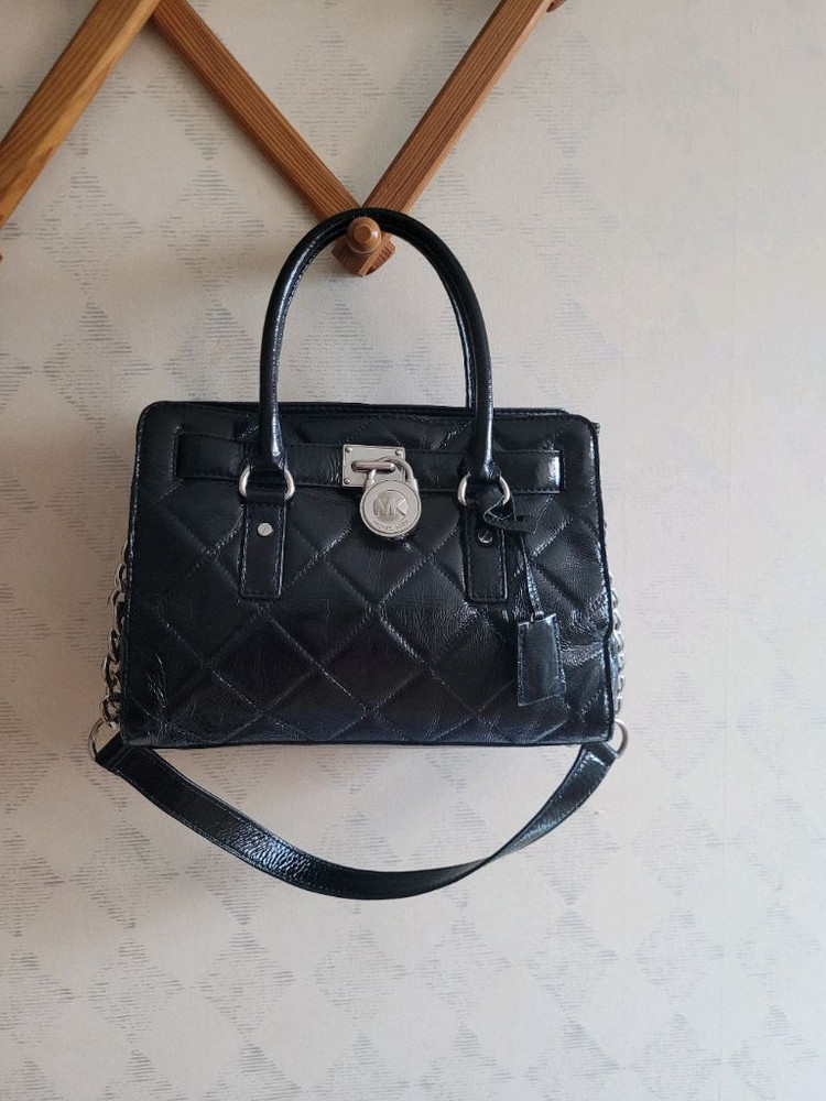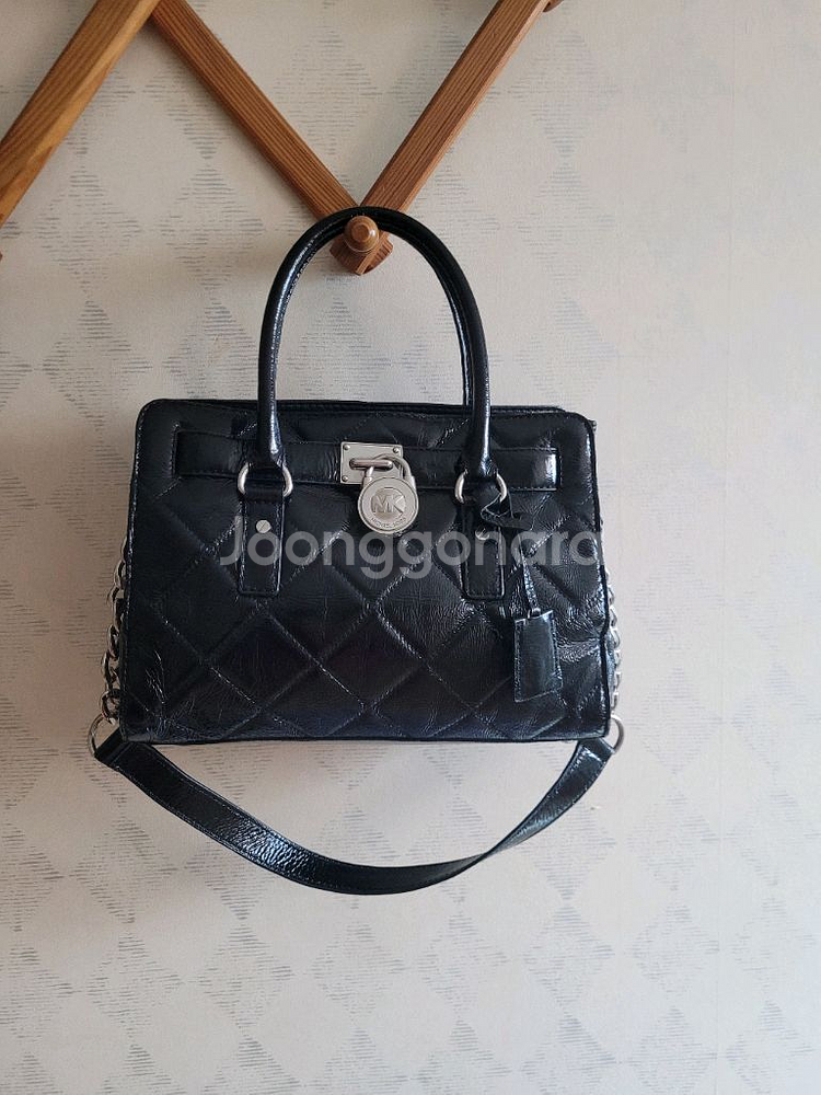 마이클코어스 퀼팅 토트백입니다. 사이즈 가로30cm 세로23cm - 색상은 블랙이고, 퀼팅 디자인이 멋스러워요. - 은색 체인과 잠금장치 포인트가 있습니다. - 가방 내부에 마이클코어스 로고 패턴이 있어요. - 사용감은 매우 적어 전체적으로 깨끗합니다 내부도 깔끔한 상태입니다. 클래식하면서도 세련된 디자인으로 오래 사용하기 좋아요.