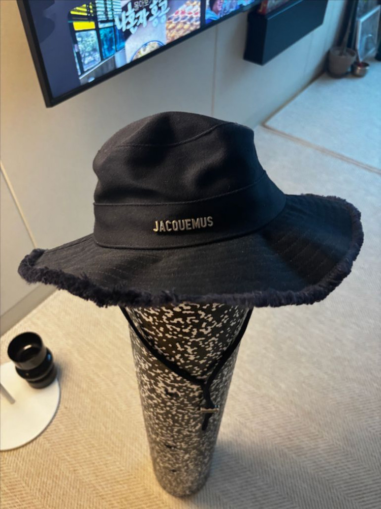 블랙 버킷햇이에요. 모서리 부분에 프린지 디테일이 있어서 스타일리시하고, 전체적으로 상태 양호합니다. 택도 붙어있고 미착용품입니다 사이즈는 58입니다