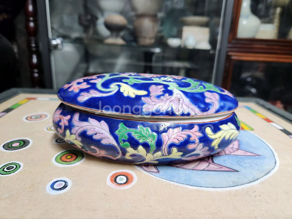 중국 빈티지 도자기 분채 합(인주합) 타원형 기물로 원형인주합은 흔하나 타원형 인주합은 잘보이지않는 도자기입니다.. 건륭년제 관지 있으며 길이17cm 폭11cm높이 7cm 파란색 바탕에 화려한 꽃과 잎사귀 패턴으로 장식된 타원형의 뚜껑이있는 도자기로.. 주로 인주 도장을 찍는 데 사용하는 붉은색 인영(印泥))를 보관하는데 사용되었으며, 작은 장신구 등을 보관하는 용도로도 사용됩니다. 분채(粉彩) 기법은 유약 위에 에나멜 안료로 그림을 그린 후 저온에서 다시 구워내는 중국 도자기의 한 종류입니다. 가격..4만(착불) 답십리역1번출구