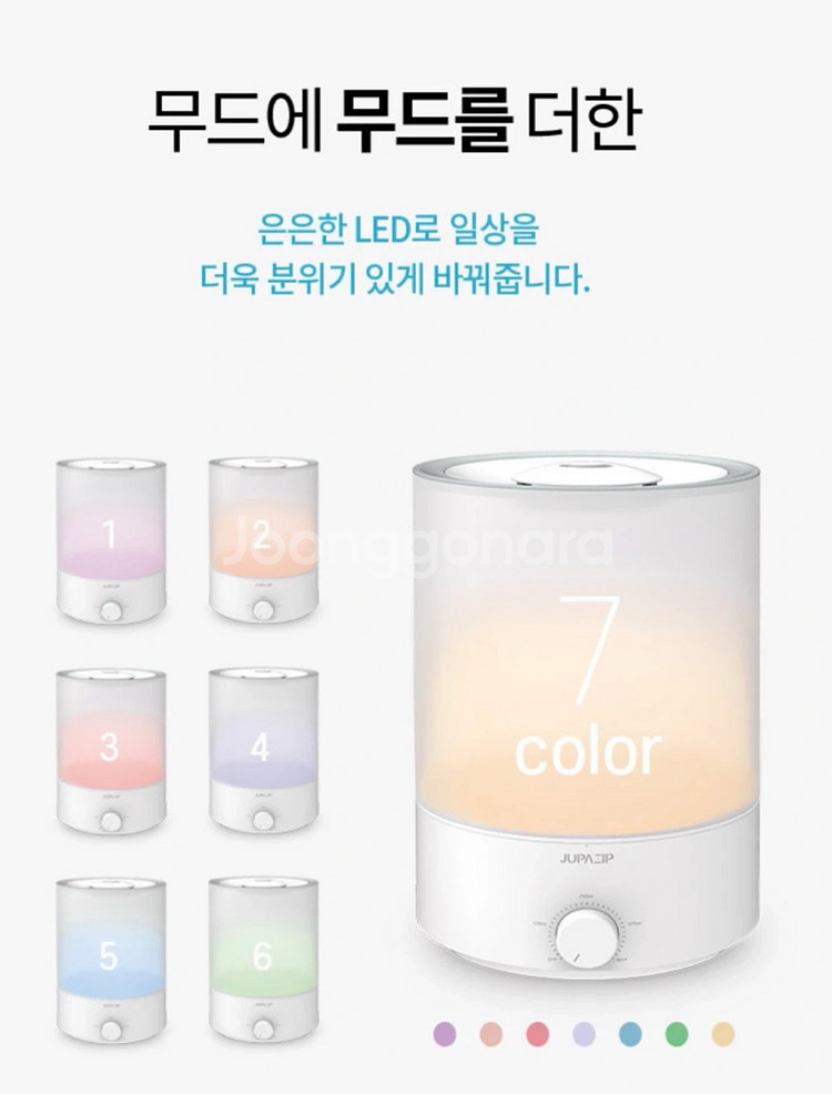 7가지 컬러의 LED 조명 기능이 있는 가습기예요. 박스 상태로 새 제품 같아 보이고, 다양한 색상으로 분위기를 연출할 수 있어서 정말 예뻐요! 주파집 SOOPIA 프리미엄 초음파 가습기입니다 - 4L 대용량으로 넉넉하게 사용 가능해요 - 7가지 컬러의 LED 무드등으로 은은한 분위기를 연출할 수 있습니다 - 초음파 가습 방식으로 저소음으로 작동하여 조용하고 쾌적한 환경을 만들어줍니다 - 최대 40시간까지 가습이 가능합니다 - 소비전력은 12-24W입니다