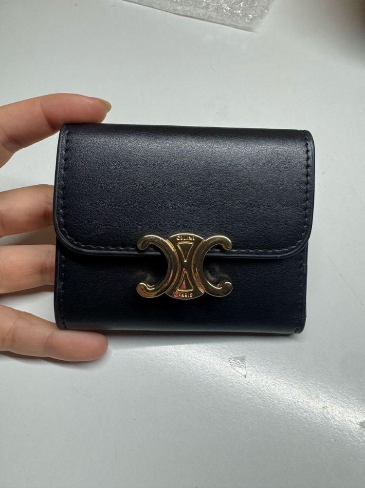 정품 트리옹프 반지갑이에요. 블랙 레더에 골드 로고가 포인트로 고급스럽고, 카드 수납공간도 넉넉해서 실용적이에요. 사용감은 있지만 전체적으로 깔끔한 상태입니다.