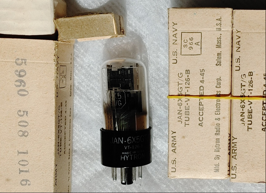 하이트론 6X5GT/G 군용 정류관 미개봉 판매. - JAN VT-126B : 미군용 - Date Code: 4-45 (1954년 45주 미국산) No -Open: 미개봉 ** 6ZY5, 6Z5P와 호환관 55,000원/개 +5,000원(우체국 택배비) 공일공 사오39 구구40 (서울, 문자환영)
