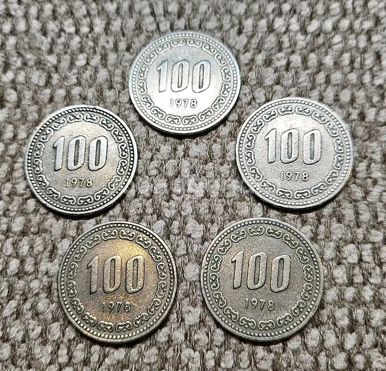 1978년 발행된 100원 동전 5개 1세트 입니다. 사용감은 있지만 전체적으로 양호한 상태예요. 수집용이나 교육용으로 좋을 것 같습니다.