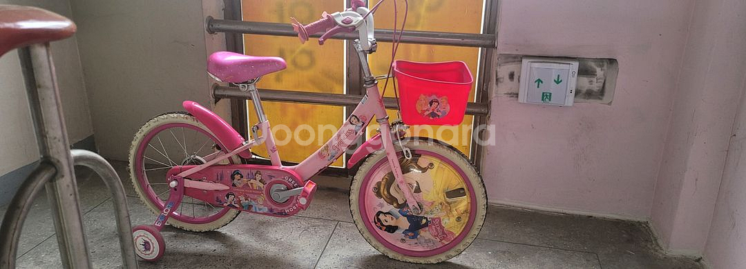 몇년전 어린이날 집앞 삼천리 자전거에서 28만원주고산 아동용 자전거예요. 핑크색 바탕에 귀여운 캐릭터들이 그려져 있고 앞바구니도 포함되어 있어요. 사용감거의 없어요 상태좋아요