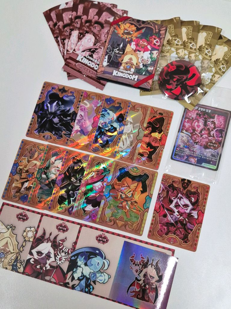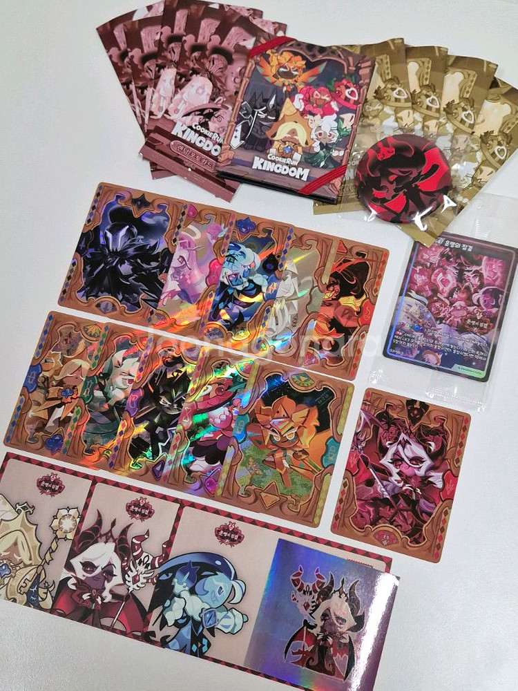 쿠키런 킹덤 포토카드 에인션트5+비스트5+어둠마녀+운명의 집결 카드까지 올클리어 세트입니다. 사진에 나온 아코디언북, 퓨바/어마/쉐밀 엽서, 어둠마녀 캔뱃지, 어마 홀로그램 스티커 같이 드립니다. +파파존스 독버섯 키링+어마쿠폰(1000크탈+500무큐) 원하시면 행사에서 받은 핫팩이나 만화책도 드려요 구매 원하시면 문의주세요.