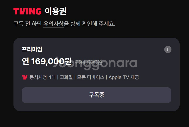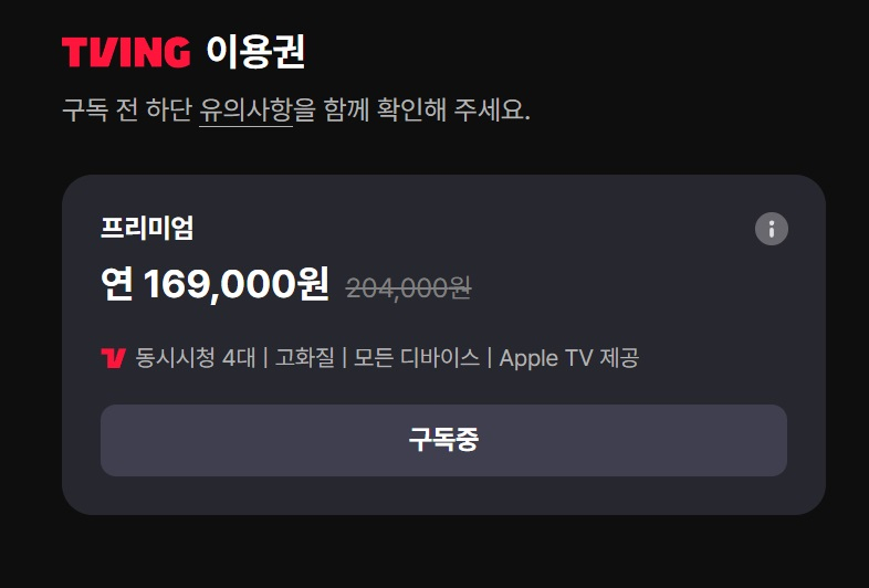 티빙 프리미엄 12개월 같이 보실 분 구합니다. 3년째 유지중인 파티이구요, 1자리 비었습니다. 아쉽게도 26.01.01.자로 프리미엄 이용권 가격이 인상되어 169,000원이네요... 1/4 하게 되면 개인 당 42,250원입니다. 1년간 같이 보실 파티원 계시면 연락주세요 기간은 2026.02.08.~2027.02.07. 입니다.
