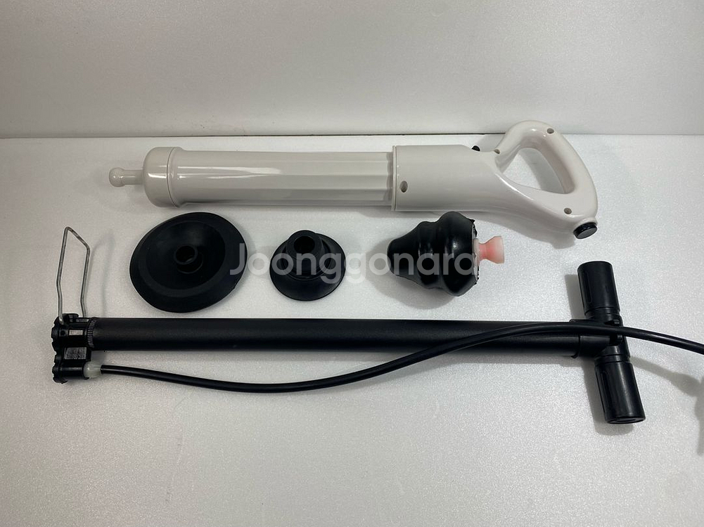 배관청소기와 각종 부속품들이 포함된 세트입니다. 사용감은 있지만 작동에는 문제없어 보여요. 배관 청소나 수리 작업에 유용한 제품입니다.