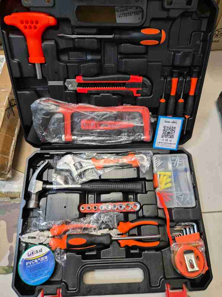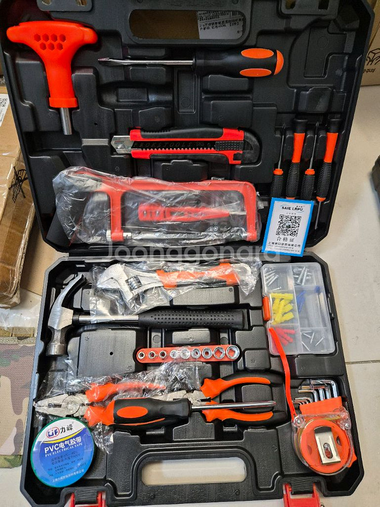 가정에서 유용하게 사용할 수 있는 수공구 세트입니다 다양한 공구들이 검정색 케이스에 깔끔하게 정리되어 있습니다 주황색 손잡이로 디자인되어 사용하기 편리하며, 미사용 새제품이라 상태 매우 좋습니다 - 구성품: PVC 전기 테이프, 칼, 톱, 망치, 렌치, 드라이버, 펜치, 육각렌치, 줄자, 나사 및 칼블럭 등