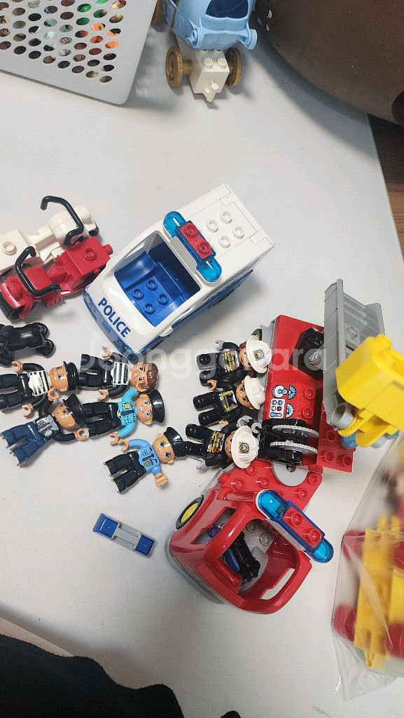 남자아이들이 좋아할 구성입니다. 도둑 둘 경찰셋. 소방관 셋입니다. 불도 들어와요. 그럴싸한 감옥도 드려요. 중장비는 두세트 합본입니다. 없는 블록도 있어요. 사람 하나와 ㅇX표지판 등 입니다.