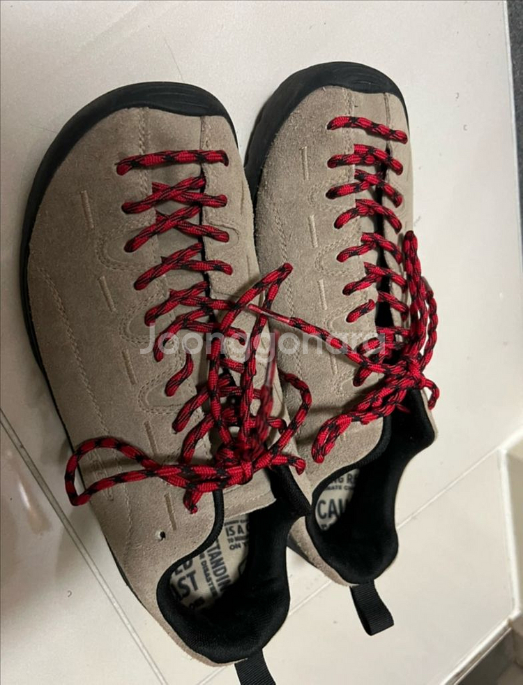 275사이즈 등산화예요. 베이지 컬러에 레드 끈으로 포인트를 준 디자인이 특징이고, 전체적으로 깔끔한 상태입니다.