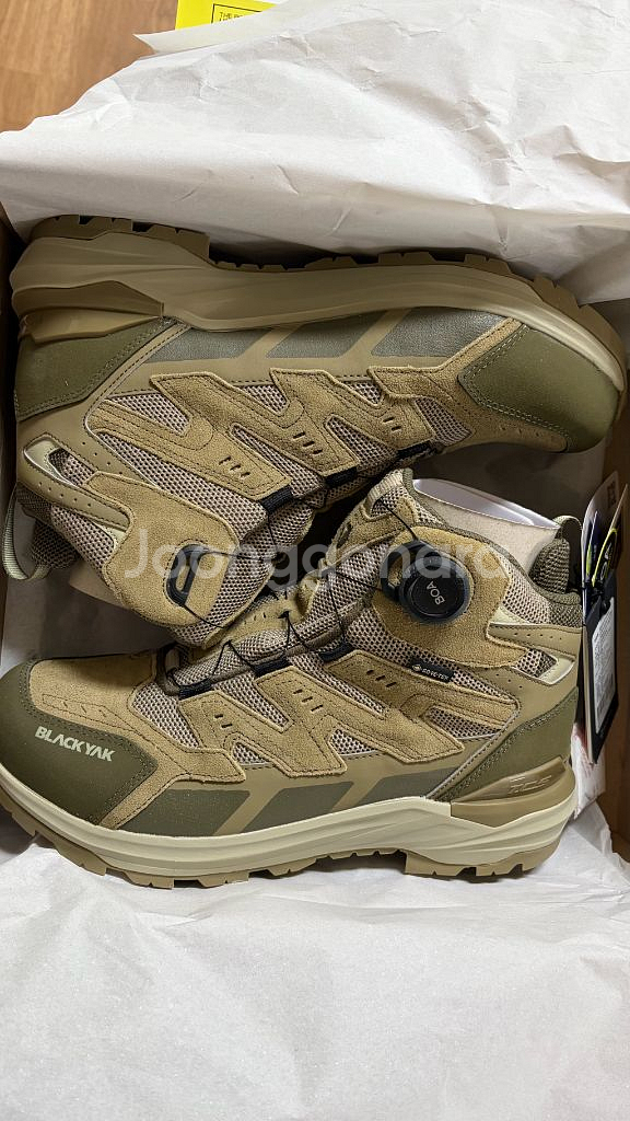 고어텍스 소재의 등산화예요. 박스와 태그가 모두 있는 새 제품 상태이고, 270MM 사이즈입니다. 방수 기능이 뛰어나서 등산이나 아웃도어 활동에 좋아요. 카키색입니다
