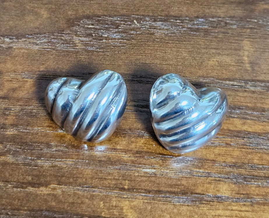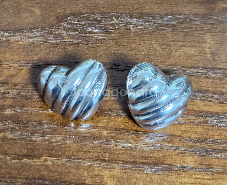 뉴욕빈티지샵 구매 아주 볼드하고 중량감있는 하트귀걸이입니다 핸드메이드라 양쪽 모양이 살짝 달라요 하트크기 대략 가로 2.2센티 세로 1.9센티 총중량 7.72그람으로 무게감 있습니다 침이 두꺼워서 원래있는 클러치가 뻑뻑하게 들어가요(좀더 편하게 쓸수있는 실리콘클러치 동봉해드려요) 택배비포함 반품불가