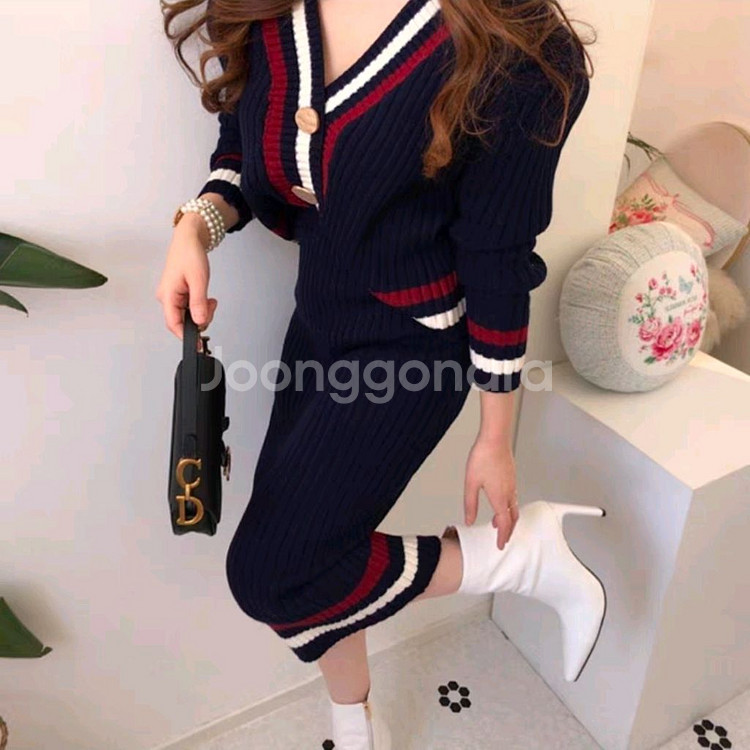 니트 원피스예요. 네이비 베이스에 레드와 화이트 스트라이프 포인트가 들어간 깔끔한 디자인이에요. 상태 양호하고 착용감도 좋습니다! 한번 착용 후 보관. 상태 깨끗해요. 치마길이 69 허리둘레 단면 30(고무밴드 최대 45) 엉덩이둘레 44 상의 가슴둘레 단면44 총장 50 프리사이즈 반품.환불불가