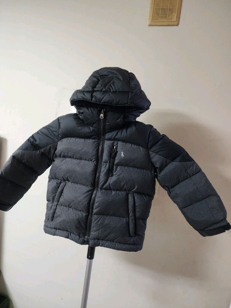 아동용 패딩점퍼예요. 후드가 있고 보온성이 좋은 다운 재킷으로 겨울철 착용하기 좋아요. 전체적으로 깔끔한 상태입니다.