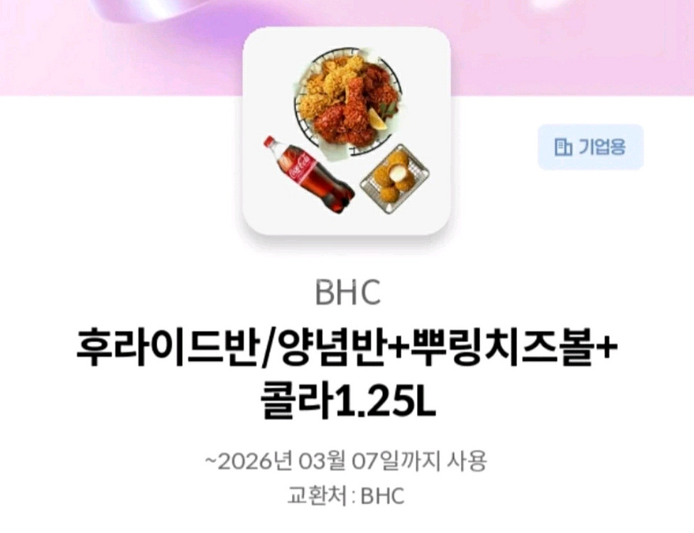 BHC 양념반/후라이드반 + 뿌링치즈볼 + 콜라 1.25L 기프티콘 판매해요. 원가 30000 -> 22200 판매 중고나라 채팅 또는 아래 번호로 문자주세요 91육오 - 육0오팔