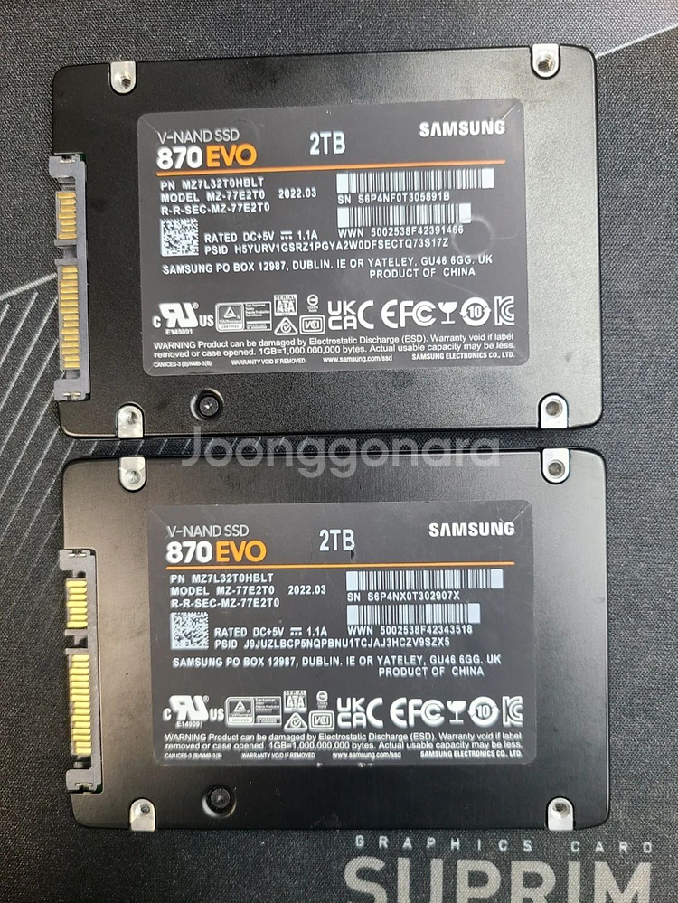 삼성 SSD 870 EVO 2TB 제조일자 22년 3월 CrystalDiskInfo 확인결과 각각 98,99% 건강상태로 매우 양호 사용시간 15033시간과 15120시간 SATA용 최대읽기 560mb/s, 530mb/s 쓰기속도 보증기간 27년 6월까지