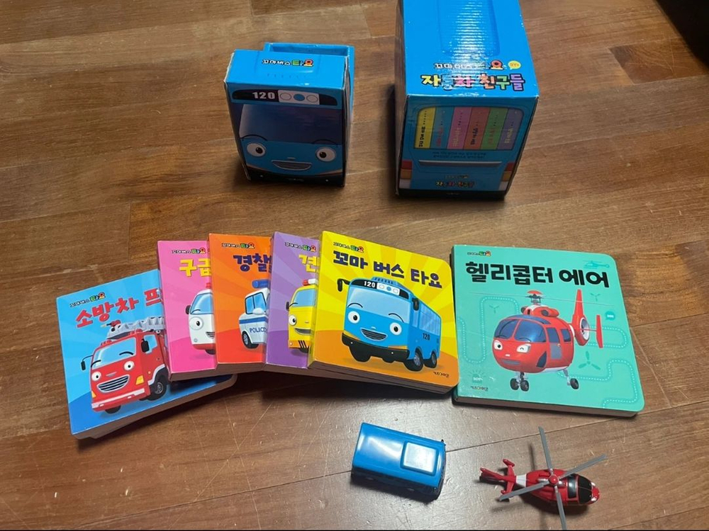 꼬마버스 타요 그림책 6권과 헬리콥터 에어 그림책 1권, 총 7권의 책 세트입니다. 책은 보드북 형태로 아이들이 안전하게 볼 수 있습니다. 책과 함께 타요 버스 장난감과 헬리콥터 에어 장난감도 포함되어 있습니다. 장난감은 사용감이 있으나, 책은 비교적 깨끗한 상태입니다. 아이들이 좋아하는 타요 캐릭터들과 함께 즐거운 시간을 보낼 수 있습니다. 뱍스도 있고. 추가로 헬리콥터를 구매했습니다 헬기 날개가 살짝 금이 가서 붙여 놓았어요.