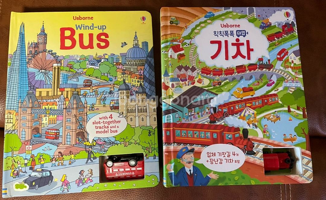 아이들이 정말 좋아하는 어스본 태엽책 버스와 기차 2권 세트입니다 책과 함께 태엽 장난감 버스, 기차가 각각 포함되어 있어요 입체 길 4개도 들어있어 책을 펼쳐서 장난감으로 놀 수 있습니다 기차는 컨디션 좋은 편이고 버스는 낙서한 부분이 있지만 퍼즐 뒤쪽이라 눈에 띄지 않아요 일괄 가격 입니다.