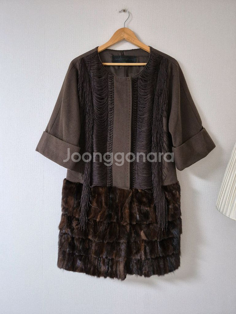 브라운 색상의 오브제 반팔 코트입니다. 밍크 트리밍이 고급스러움을 더하고, 독특한 디자인으로 눈길을 사로잡습니다. 가슴둘레 90으로, 총기장85