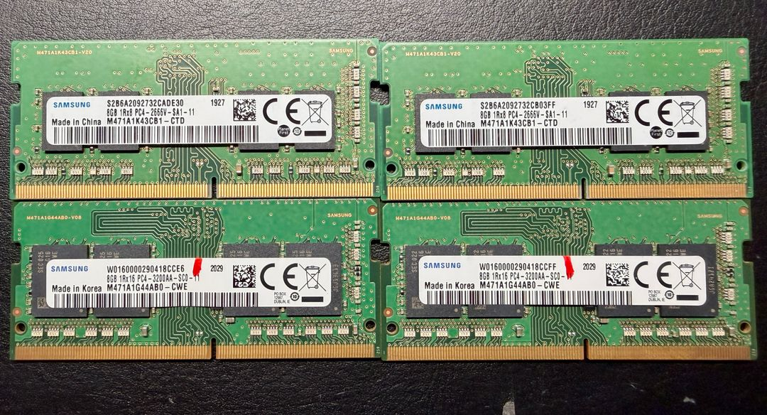 안녕하세요. 노트북 삼성전자 정품 DDR4 8GB 램 4개를 정리합니다. 보유 중인 노트북의 사양에 맞춰 구매하실 수 있도록 상세 스펙을 정리해 두었으니 확인 부탁드립니다. (일괄 판매 희망) - 일괄 20만원 - 개별 6만원 1. [상단 2개] DDR4-2666 (PC4-21300) 모델명: M471A1K43CB1-CTD 스펙: 8GB 1Rx8 PC4-2666V 특징: 호환성이 좋은 1Rx8(양면/단면 칩 구성) 제품으로, 8~9세대 인텔 CPU 노트북 등에 주로 쓰입니다. 2. [하단 2개] DDR4-3200 (PC4-25600) 모델명: M471A1G44AB0-CWE 스펙: 8GB 1Rx16 PC4-3200AA 특징: 속도가 더 빠른 3200MHz 제품입니다. (최신 노트북용) [거래 안내] 직거래: 서울 가좌역 인근 아파트 (퇴근 후나 주말 등 시간 조율 가능합니다.) 택배: 파손되지 않게 꼼꼼히 완충 포장해서 보내드립니다. (택배비 별도/반값택배 가능) AI 활용 설정 사진 설명을 입력하세요. 010-8513-5179 문자나 댓글 부탁
