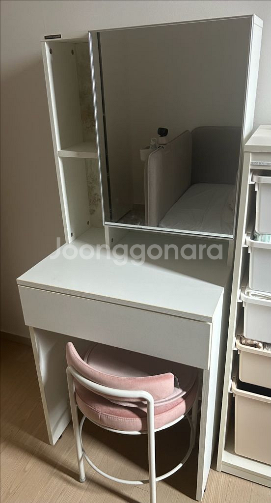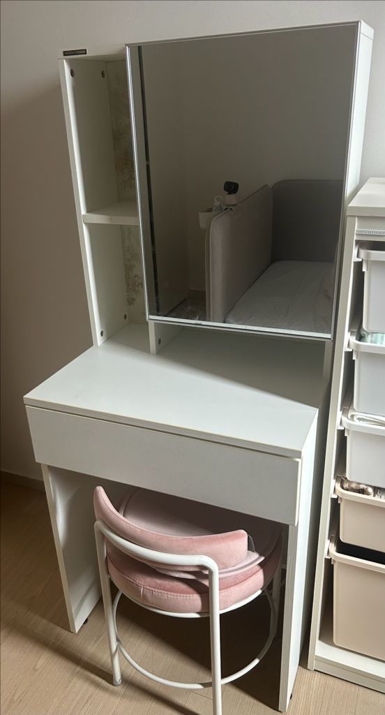 온라인상품아니고 매장상품이라 퀄이 달라요! 저가화장대사서 품질 너무 안좋아 반품하고 이걸로 샀었어요~ 거울 옆에 뜨왈천 사서 테이프로 가볍게 붙여놔서 원하시면 같이 드려요. 상부 수납이 많이 되고, 하부도 상부만큼 은근 많이됩니당! 상부안에는 콘센트있어서 드라이기나 고데기 수납하기도 좋아요. 거울 여닫이도 부드럽게 잘열리고 튼튼해요~ 서랍장 레일은 댐핑이라 소음적고 천천히 자동으로 닫혀 좋아요. 의자는 리바트 제품으로 별도입니다~ 그리고 직접 가져가셔야하는데 위치는 기흥역 근처에요~