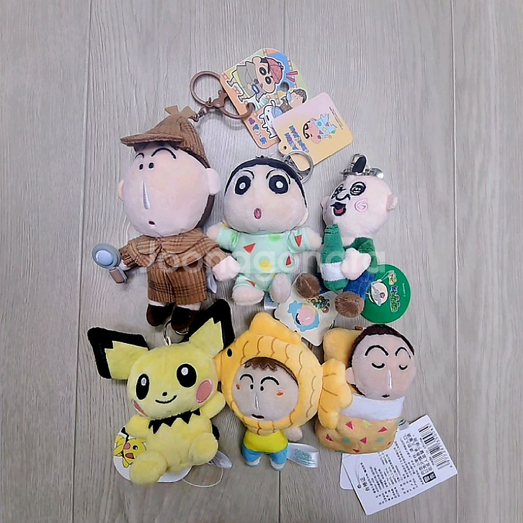 인형뽑기로 뽑은 키링인형들 판매합니다. 짱구 캐릭터, 포켓몬 피카츄, 빵빵이 키링인형 개당 4천원 일괄하시면 18,000원!! 뽑아서 보관만 하고있는 택 달려있는 새상품인데, 뽑기인형 특성상 사진 잘보시구 예민하지 않으신 분들만 연락주세요. 판매후 교환❌️ 반품❌️ 문의 있으시면 편하게 연락주세요!!