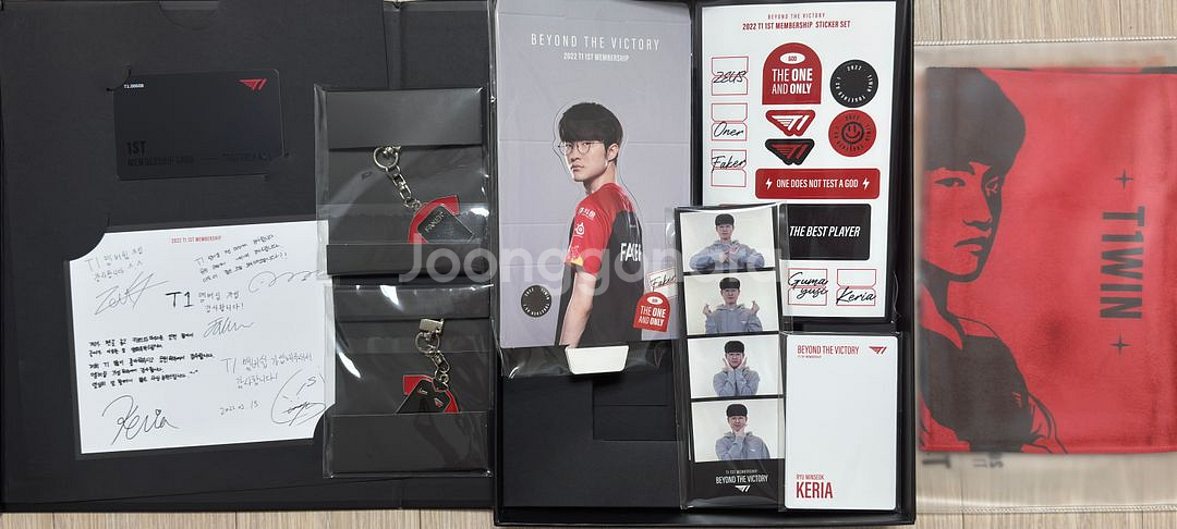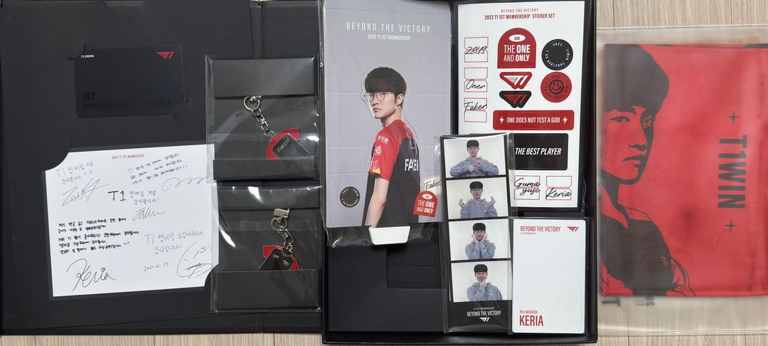 T1 멤버십 1기 웰컴세트 미개봉 상태이고 제오페구케 키링, 포카, 인생네컷, 스탠드, 타올