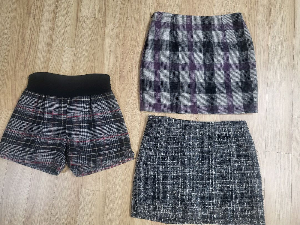 사진에 H 라인 미니스커트 2개와 숏바지 일괄로 드려요! 1. 퍼플 체크무늬 미니스커트 - M사이즈에 실측 길이는 사진에 표시된 부분 참고하셔서 허리 단면 35센티, 총길이 39센티 - 옆 지퍼 스타일에 안감 있고 앞에 양쪽 아래가 4센티씩 트여있어서 입으면 예뻐요 - 오염하자 등 이상 없습니다 2. 벨리걸 미니 스커트 - M사이즈에 실측 길이는 사진에 표시된 부분 참고하셔서 허리 단면 37센티, 총길이 37센티 - 보카시 재질에 살짝 빈티지 느낌과 은사가 반짝거려서 멋스러워요 - 뒷지퍼 스타일에 안감 있으며 백화점에서 구매했었고 오염하자 등 이상 없습니다 3. 모직 반바지 위의 두 치마와 같이 입었던 모직 바지인데 두껍지 않아 검정 스타킹 신고 위에 입으면 예뻐요~ 덤으로 같이 챙겨드려요^^ 따뜻해보이는데 두껍지않아서 활동하기 답답하지 않고 가을~겨울 입기 좋아요~ 일괄 저렴히 정리하니 언릉 연락주세요~~ 개인 거래 특성상 교환, 환불, 반품이 불가하니 설명 읽어보시고 궁금한 점은 자세히 문의주세요~ 일반 택배 +4000원 또는 GS, CU 반값 택배 +2000원 추가시 발송 가능해요~