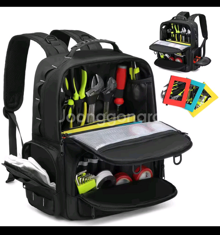 미사용 새제품 공구 백팩 YB026B 모델입니다 색상은 블랙이며, 크기는 약 40cm x 36cm입니다 내부에 다양한 수납공간이 있어 공구 정리하기에 용이하며, 튼튼한 디자인으로 헤비 듀티 작업에 적합합니다 추가로 컬러 파우치 3개(주황, 노랑, 하늘색)도 함께 드립니다 #2
