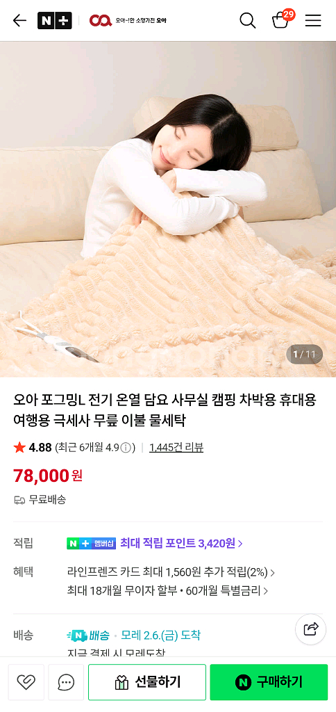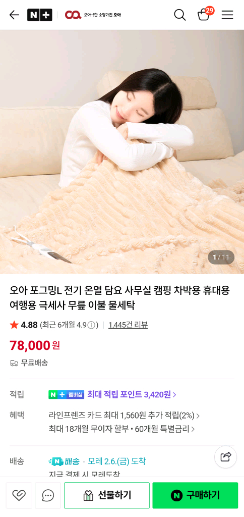 오아 포그링 L 전기 온열 담요입니다 사무실, 캠핑, 차박, 여행 등 다용도로 활용 가능하며, 극세사 소재로 부드러운 촉감을 제공합니다 물세탁이 가능하여 관리가 용이합니다 박스도 뜯지않은 새제품 6만원 한번 캠핑다녀와서 빨래해둔 제품 5만원 두개한꺼번에 10만원입니다 색상 베이지