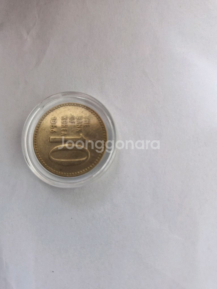 1966년 발행된 10원 골드바입니다. 투명 케이스에 보관되어 있어 상태가 양호해요. 수집용이나 투자용으로 좋을 것 같습니다.