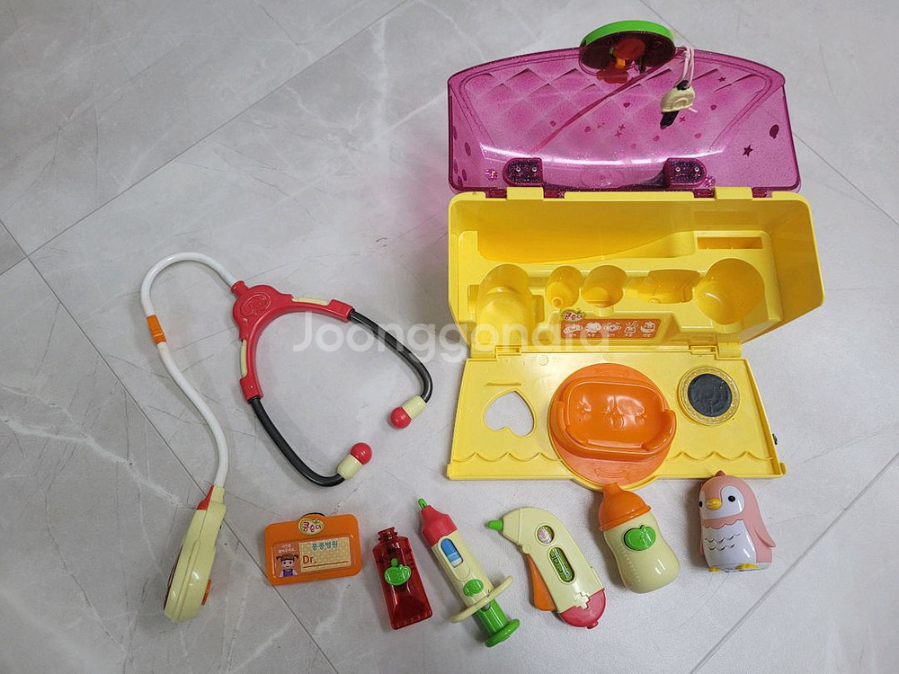 콩순이 병원놀이에요 청진기 소리, 불빛, 노래 잘 나와요 펭이도 작동 잘하는데..우유 주면 마시는 소리 나는 건 안나와요 사용감 있어서 싸게 팔아요 택배비 불포함이에요 제 게시글 보시고 필요한거 있으시면 택배비 아끼세요 ^^