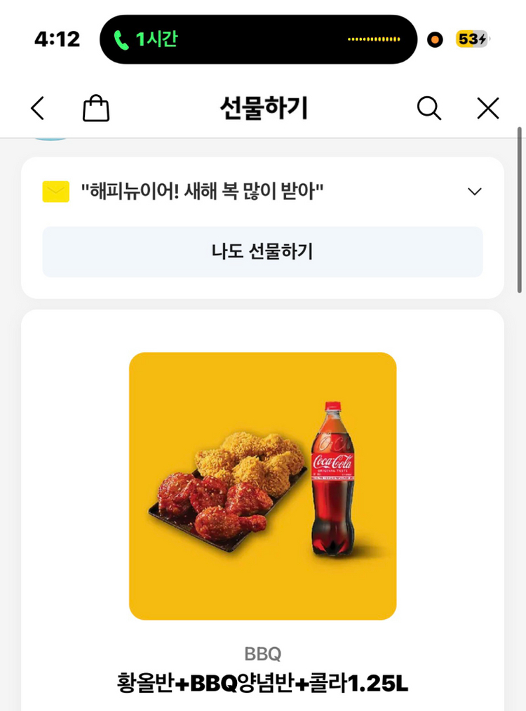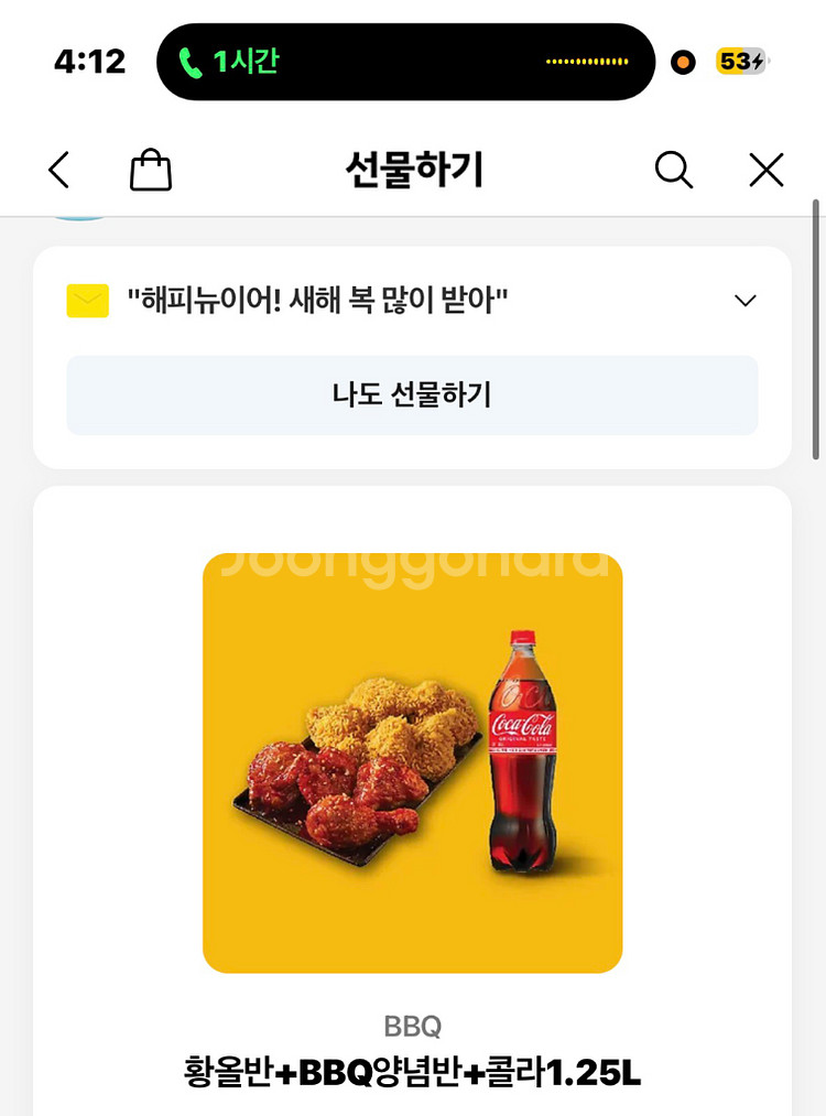 황올반+BBQ양념반+콜라 1.25키프티콘 급하게 팔아요( 원가 26500원)