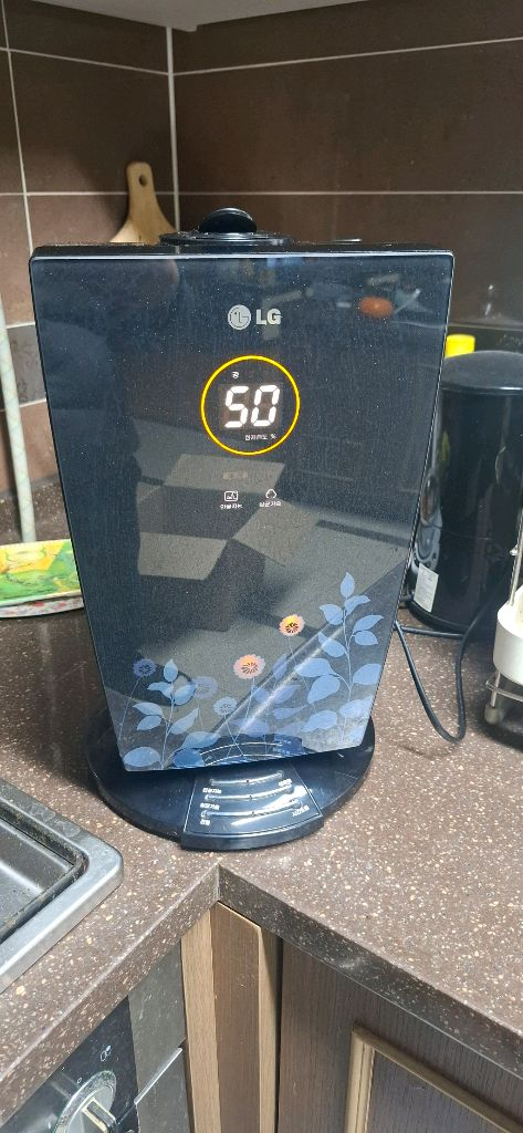 LG가습기예요. 디지털 디스플레이와 블루 플라워 패턴이 예쁘고, 사용감은 있지만 정상 작동합니다. 구입가30만원